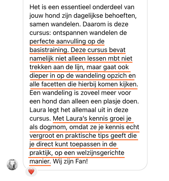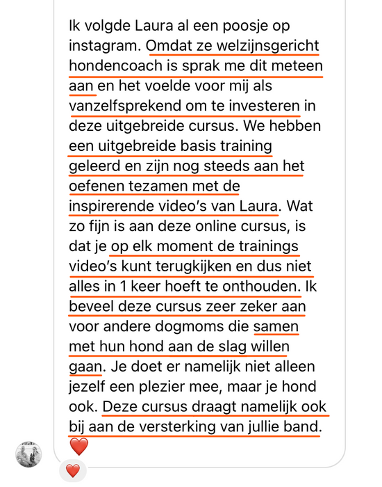 "Met Laura's kennis groei je als dogmom. Ze vergroot je kennis en geeft praktische tips die je direct kunt toepassen op een welzijnsgerichte manier."